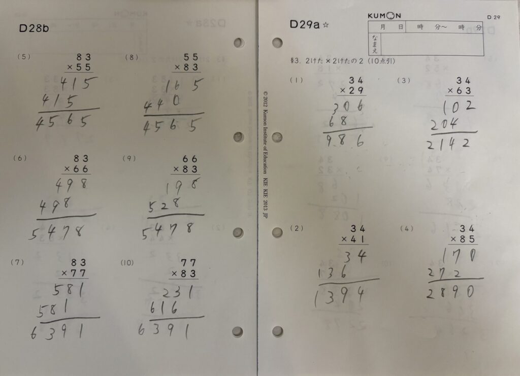 現在はD教材(2桁以上の掛け算・割り算・分数)に入っているので、引き続き1回5枚のペースで進めています。単元が変わっても、基本的にはこの枚数で安定している印象です。